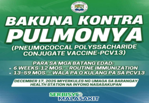 Handog ng Pamahalaang Bayan ng Tanza sa pangunguna ni Mayor Archangelo “SM” Matro ang Bakuna Kontra Pulmonya (PCV13) na gaganapin sa December 17, 2025, Miyerkules ng umaga, sa bawat Barangay Health Station.