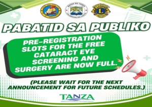 Ipinapaalam sa lahat na puno na ang pre-registration slots para sa Free Cataract Eye Screening and Surgery.