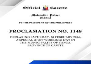 Idineklara sa ilalim ng Proclamation No. 1148 ang February 28, 2026 bilang Special (Non-Working) Day sa Bayan ng Tanza, bilang paggunita sa 112th Araw ng Tanza.